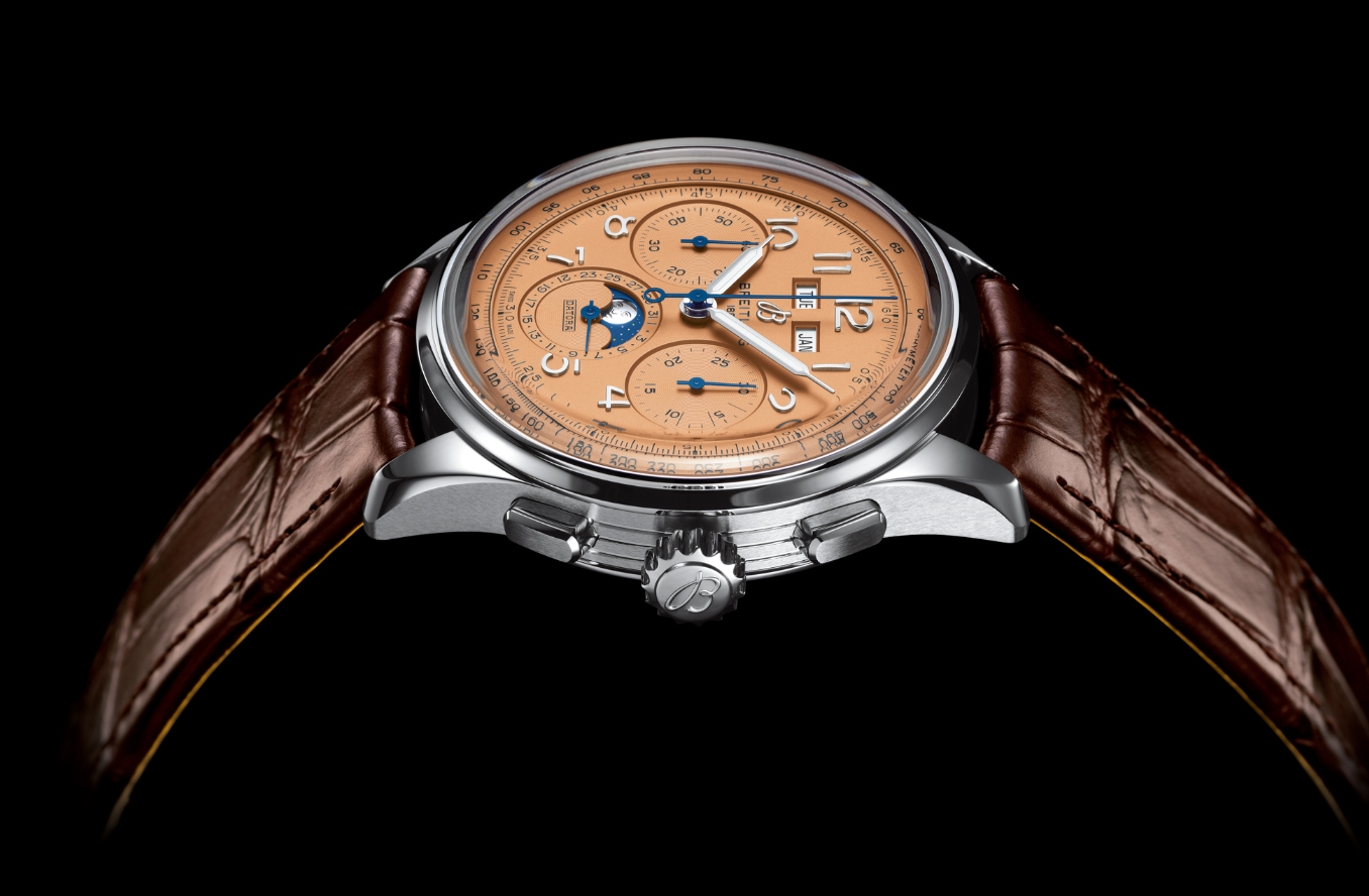 Regardless of design intent, the modern AAA Breitling replica watches tend to be more of a sporty expression, so to bring the two value systems of two entirely different eras together, we’ve got slightly upsized cases (40mm for the standard handwound chronograph, and 42mm for the split second & complete calendar variants) and 100 meters of water resistance for each. The latter feature is a particularly interesting development – just how many complete calendar chronographs can you name that have more than a paltry 30 or 50 meters of water resistance? This particular combination of complications is already a relatively rare one (Jaeger-LeCoultre, Parmigiani, Blancpain, and IWC each have something that comes close), but wrapped up here in a beautiful salmon dial and finished with enough water resistance to make this a proper everyday wearer makes this particular reference one hell of an interesting proposition.